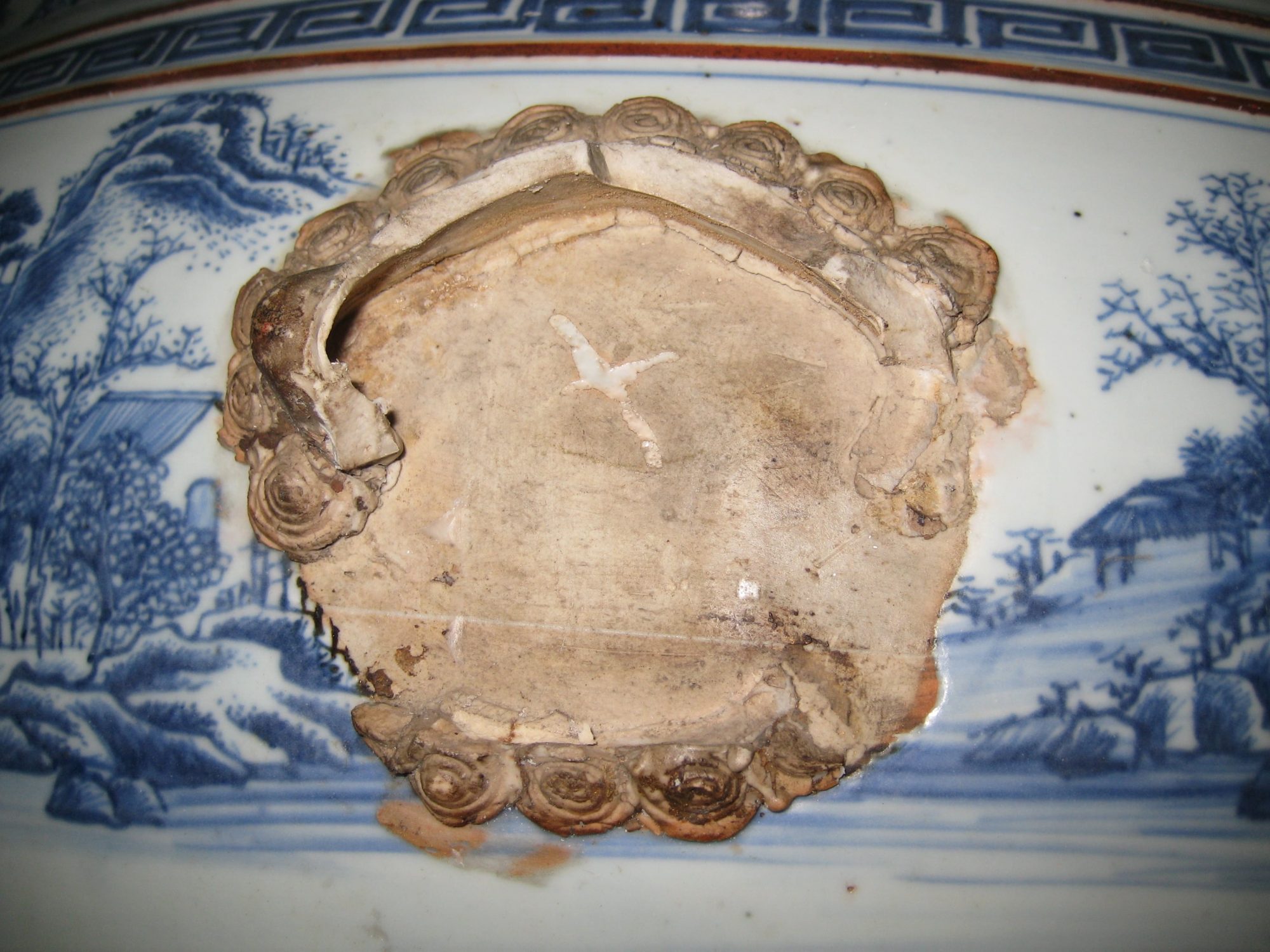 The fish bowl had previously been repaired extensively. Old breakages had been repaired with adhesives that had become brittle and had shrunk over time. A metal band had also been applied around the foot to add stability.