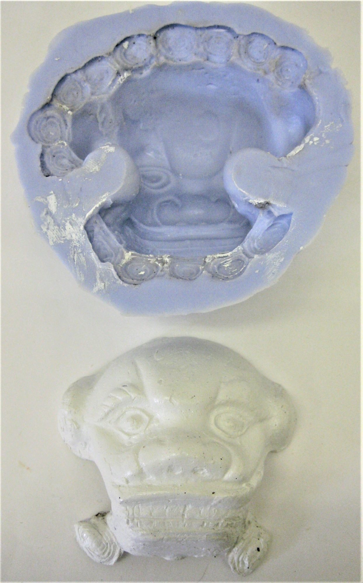 The missing handle/lug was remodelled by firstly taking an impression/mould from an extant handle in a quick setting silicone impression material. Then, an epoxy putty was pressed into this mould and once cured it was refined and bonded in place over the missing area. Small missing areas were in-filled with a coloured epoxy paste, comprised of an epoxy resin, fumed silica, and artist’s dry powder pigments. Where necessary decorative elements were created by retouching with a clear ceramic glaze and artists dry powder pigments.