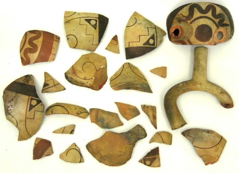 The object was broken into 22 sherds. Residues of shellac and red wax presented evidence of previous repair. The majority of the edges of the sherds (the clay body and decoration) were worn and/or chipped to varying degrees. There were two missing areas – one large, one small and small losses of surface decoration to several sherds. The surfaces were also pitted to varying degrees and these areas are ingrained with dirt.