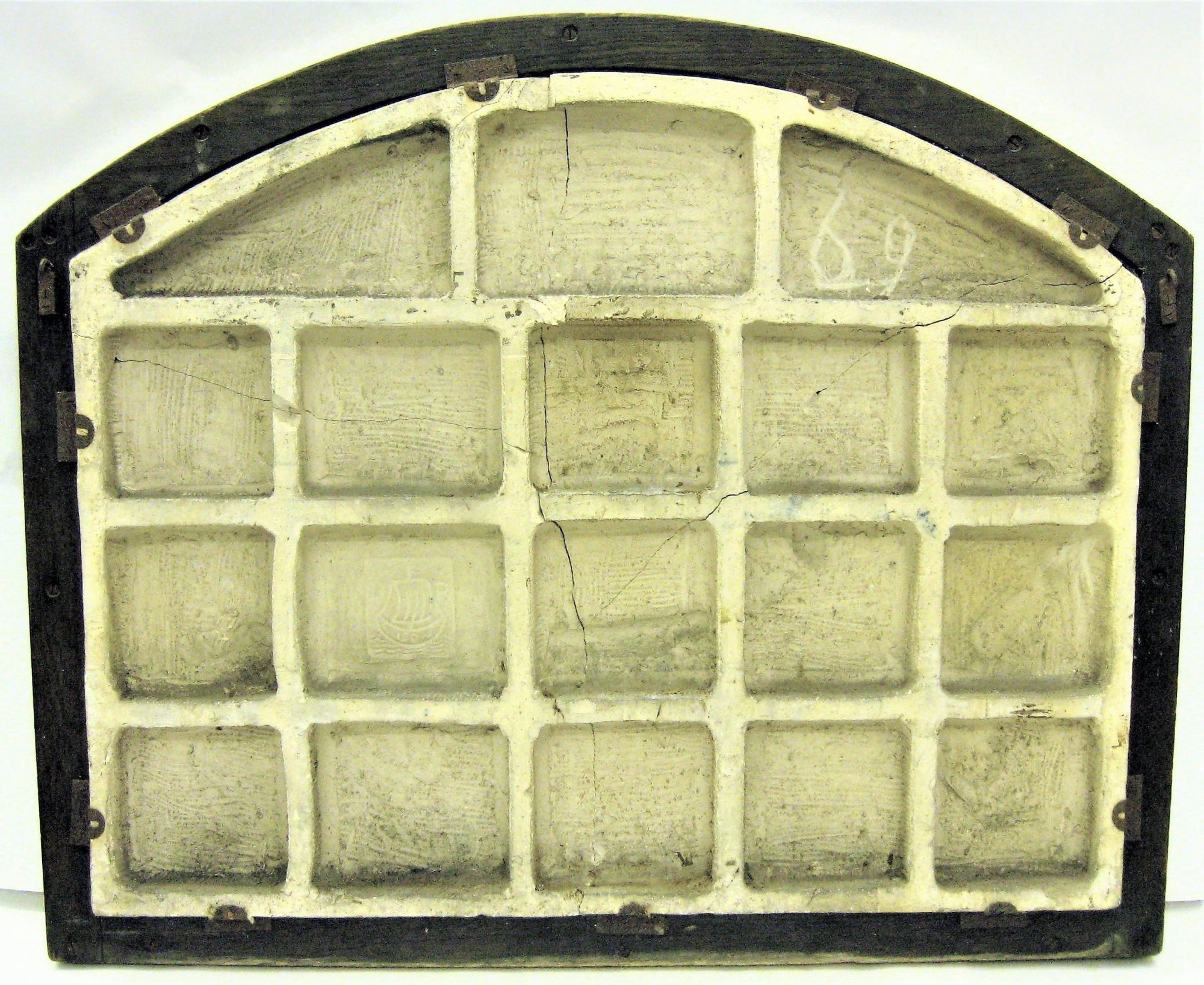 The edges of the ceramic sections were consolidated with a 7% solution of an acrylic resin in acetone. Then, they were bonded with a stronger % of the same adhesive. Any chips and missing areas were filled with either a plaster based filler or a fine acrylic filler. Large missing areas on the front of the panel were firstly core filled with a plaster based filler and then a top layer of an epoxy coloured paste was added to closely match the colours of the adjacent glaze. All fills on the glaze layer were polished with a plastic polish and then a fine polishing fabric. The fills on the back of the plaque were retouched with acrylic paints with the addition of a matt medium.