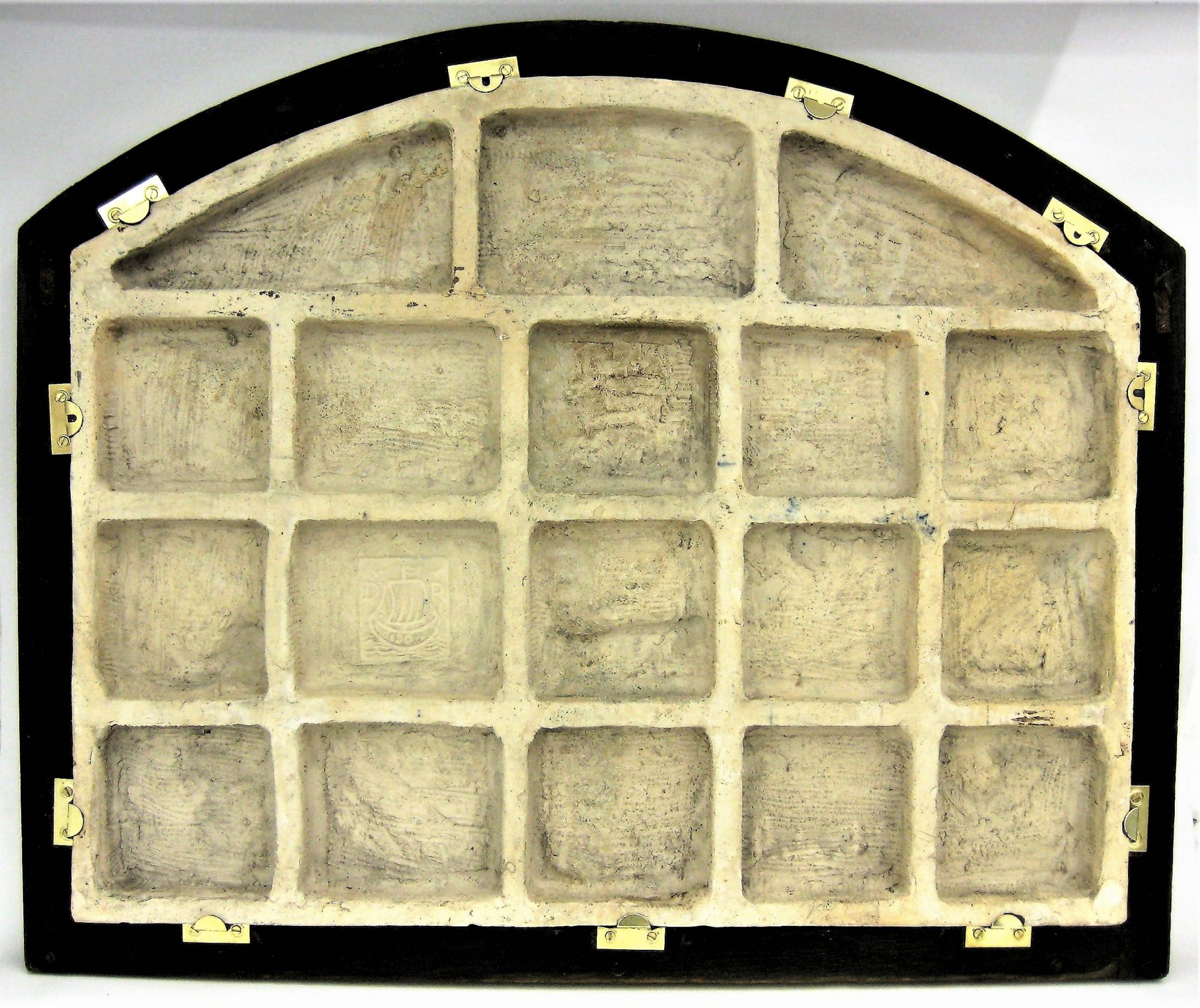 Before coming to the studio, this plaque had remained in the garage of its owner for many years. It had been damaged whilst in its frame, being broken into four sections with various losses to the front and the back. The frame was in good condition, although dusty but its mirror plates required replacing.