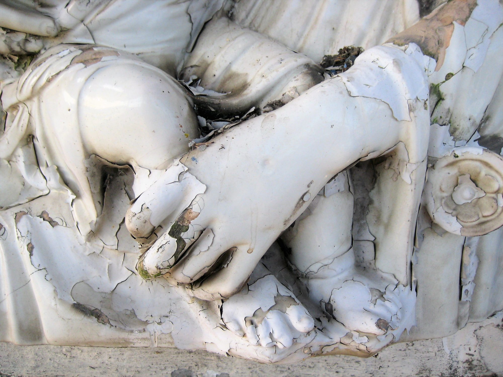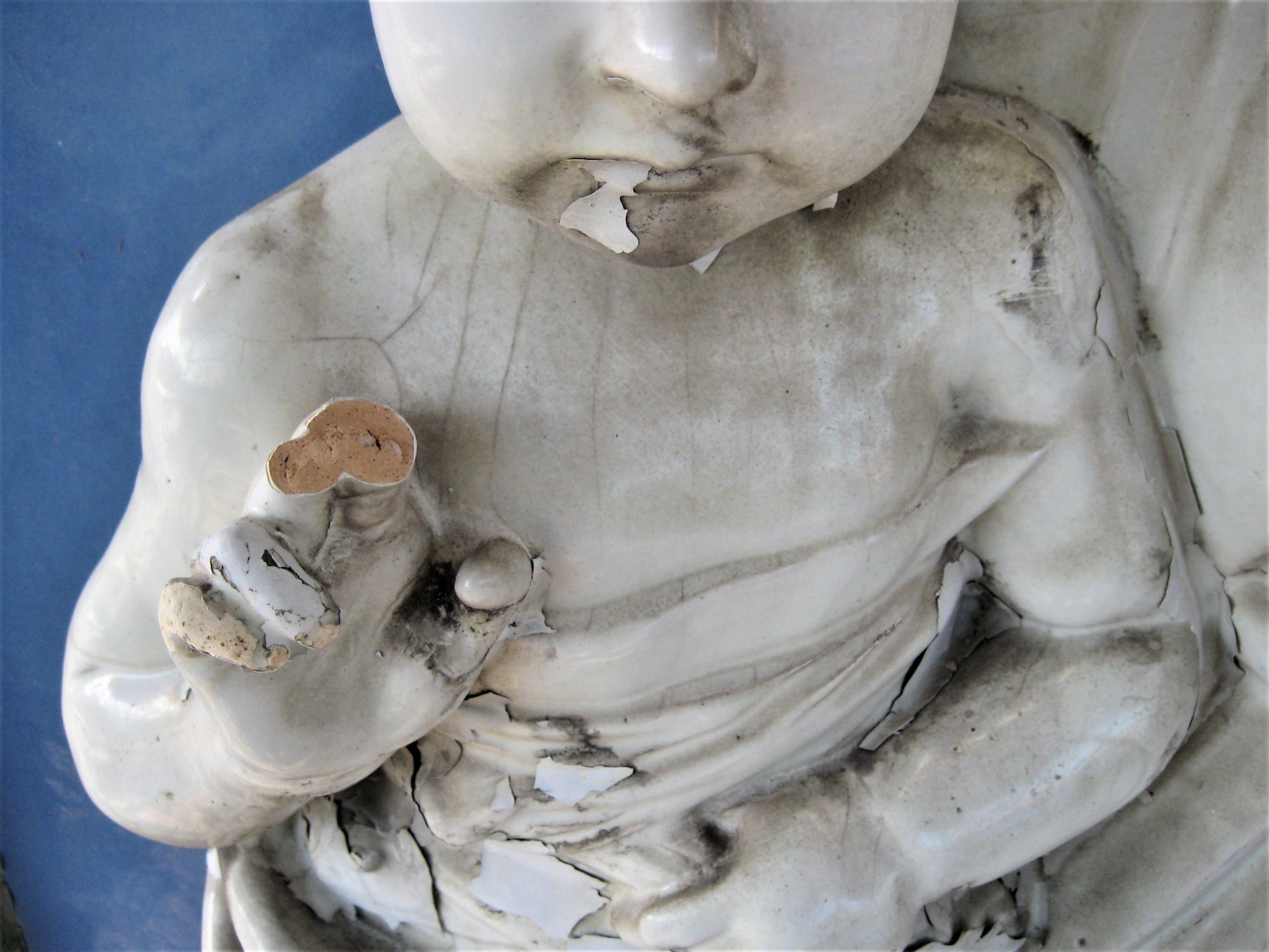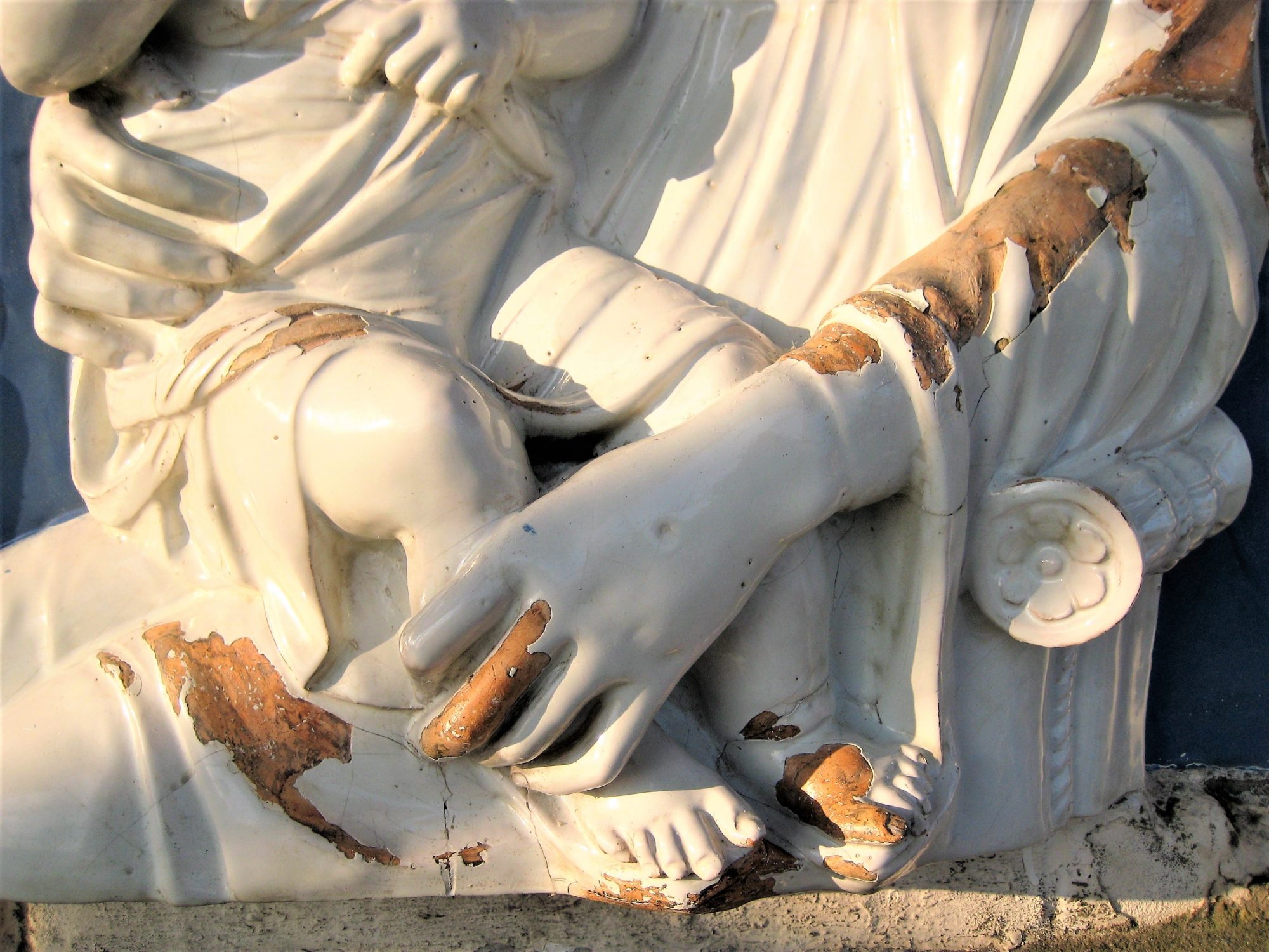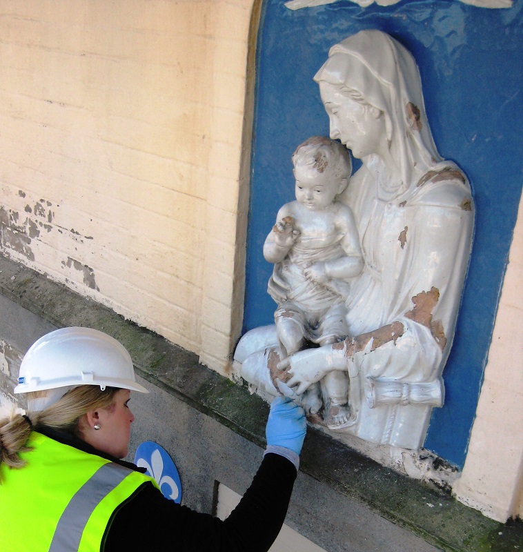 The missing areas of glaze were mimicked/in-filled using a coloured polyester paste. Once cured, after 1 hour, the polyester colour fills were refined and polished with various grades of sanding fabric and files. These were further toned with a mixture of a clear acrylic glaze and artist’s dry powder pigments. The retouching medium was applied by brush, and the final layer was polished with various grades of sanding fabric and then with a plastic polish. A protective layer of an epoxy resin was applied over in-filled and retouched areas.