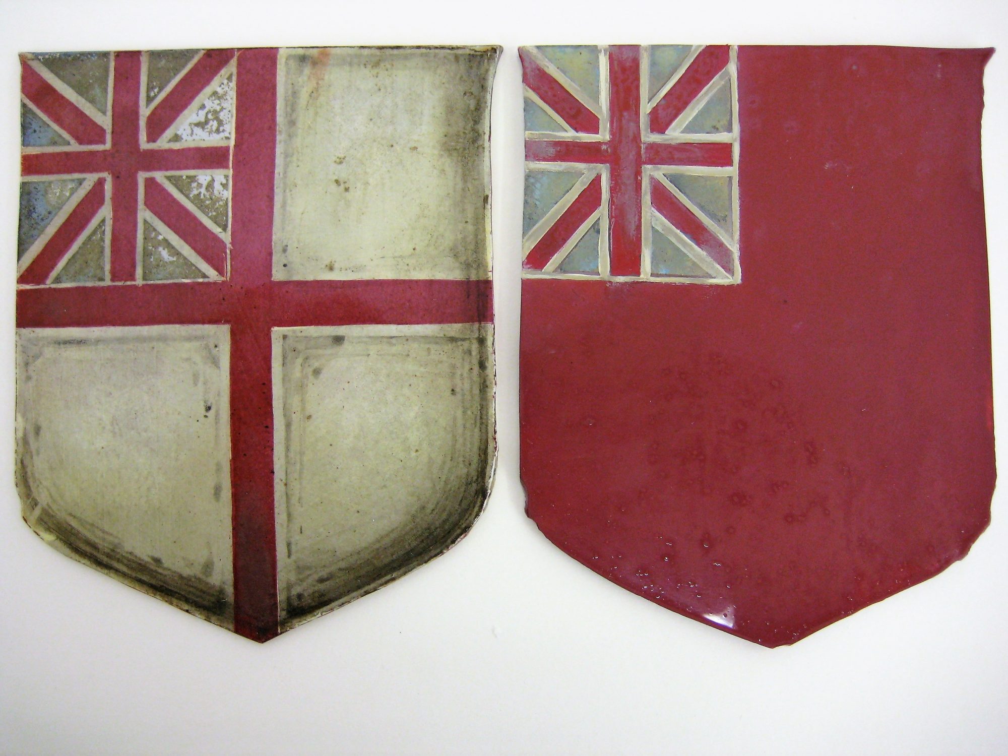 Once mounting was complete, three areas of loss were identified: the shield bearing the ensign of the Merchant Navy (evident from an archived photograph) and a missing piece from the sunbeam and the leg of the soldier. Other than a predominance of red rather than white, the design of the Merchant Navy shield had the same layout as that of the Royal Navy. The Royal Navy shield was therefore used to form a template for replication. Due to its size, it was decided to not cast the replica shield in a resin but to cut it from an appropriate thickness of white opaque glass. The decoration was then painted with a signwriter’s enamel paint. The other missing areas were cast, away from the panel in epoxy. The sunbeam cast was tinted with artists’ dry powder pigments to mimic the colour of the original glass and before epoxy had cured, when it was ‘just’ tacky, this cast was gilded on the reverse with 23.5ct gold leaf. The cast area from the leg of the soldier was retouched with a clear acrylic glaze and artists’ dry powder pigments. All replicated areas were adhered to the backboard as previously detailed.