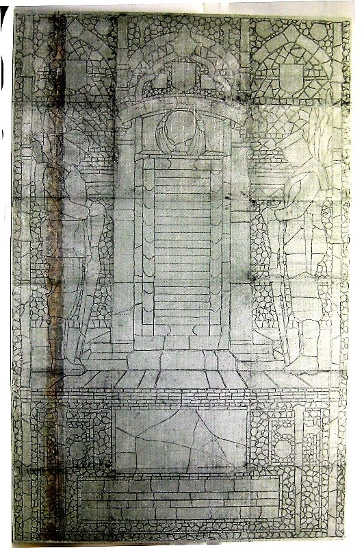 On acceptance by EDGE the mosaic had already been removed from situ and faced-up (Phase 1) with Japanese Tissue. This temporary protective skin retained the glass, keeping it in its original position . Several glass pieces had become detached before the panel was faced-up and these had been stored separately.