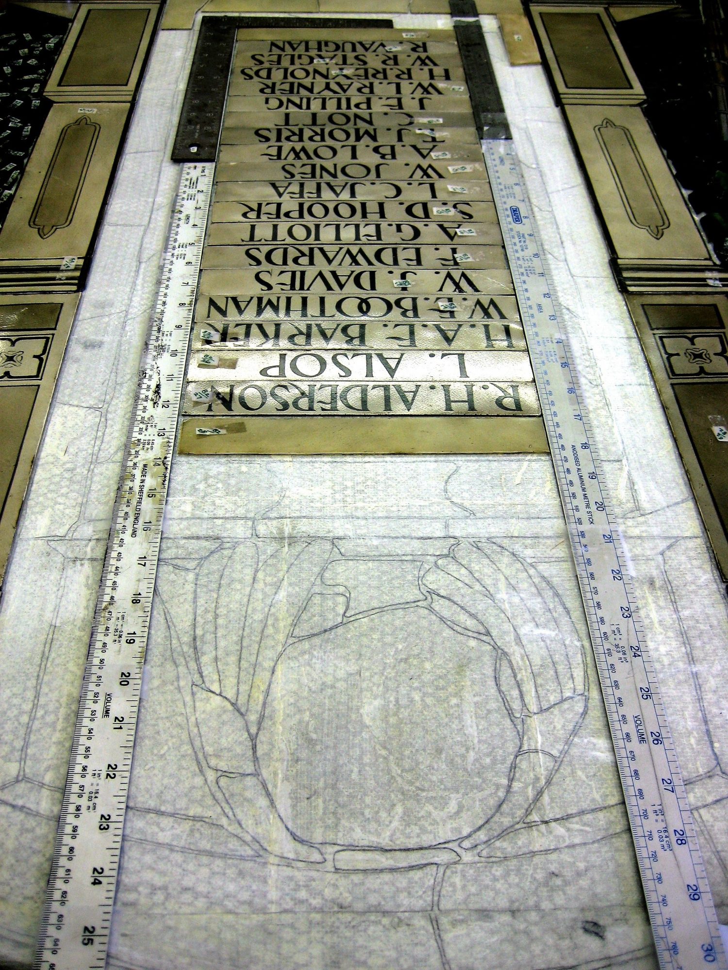The transferral of the design to the backboard had to be accurate and clear; there was little margin for error. Several options were considered, including transferral using the pouncing technique or carbon paper. The chosen method was to overlay the 18 Melinex maps with Spider Tissue and trace the design onto these in pencil; but omit the reference numbers of each piece of glass. The Melinex maps were then joined together to re-form the whole plan and this was placed on top of the new backboard. From this, the layout was marked up in pencil around the edges of the backboard so that the Japanese tissue tracings could be accurately placed. The Melinex was then removed and the tissue tracings permanently adhered to the backboard