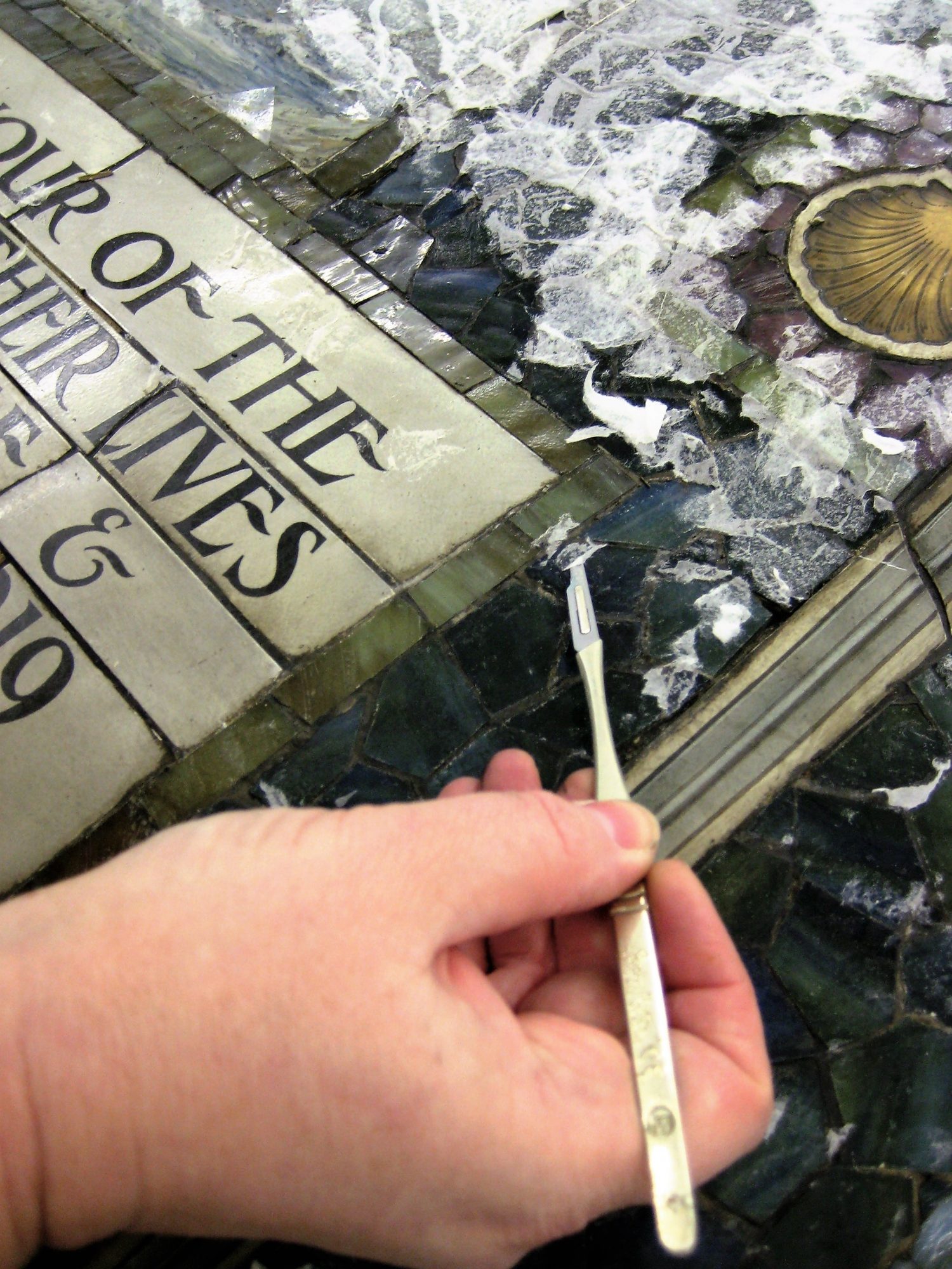 Excess mortar was removed with a scalpel blade and any residual mortar or dirt removed with the gentle application of a suitable grades of sanding fabric; using grades that did not abrade the glass.