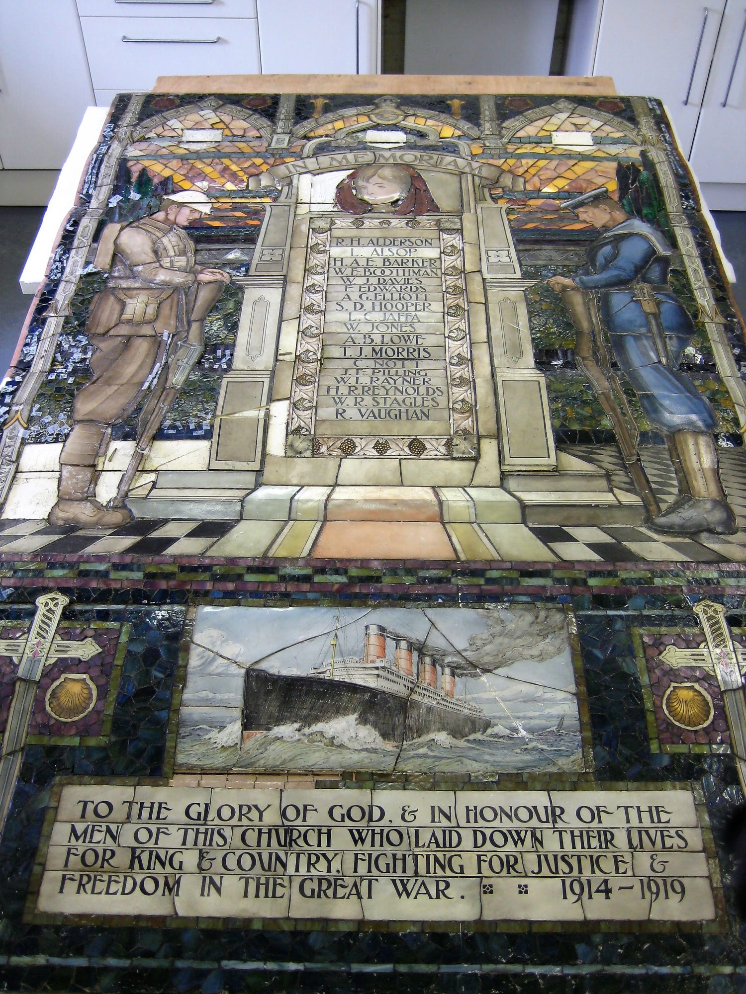 The memorial is sited centrally on the east wall of the south transept. It is comprised of a mosaic glass panel and sandstone surround. The mosaic is a combination of Opus Sectile, smalti and reverse-gilded glass, which totals just less than 3000 pieces. Non-decorated, coloured glass is rippled, whereas the Opus Sectile is decorated with fired enamels and has an egg-shell finish. Originally, all glass was embedded into lime mortar on wooden backboards. The main focus of the mosaic design is a monument that lists 18 local servicemen of World War I, which is flanked by a soldier and a sailor. Shields with ensigns of the Merchant Navy, the Royal Navy and the Royal Standard are represented, as too is the emblem and motto of the Royal Flying Corps, Per Ardua ad Astra (Through Difficulties to the Stars). There is a fine image of the Lusitania (Cunard Liner) to the lower section of the panel, below which there is a dedication to those who lost their lives. The sandstone frame is composed of 6 sections; the bottom panel lists 35 local servicemen of World War II.