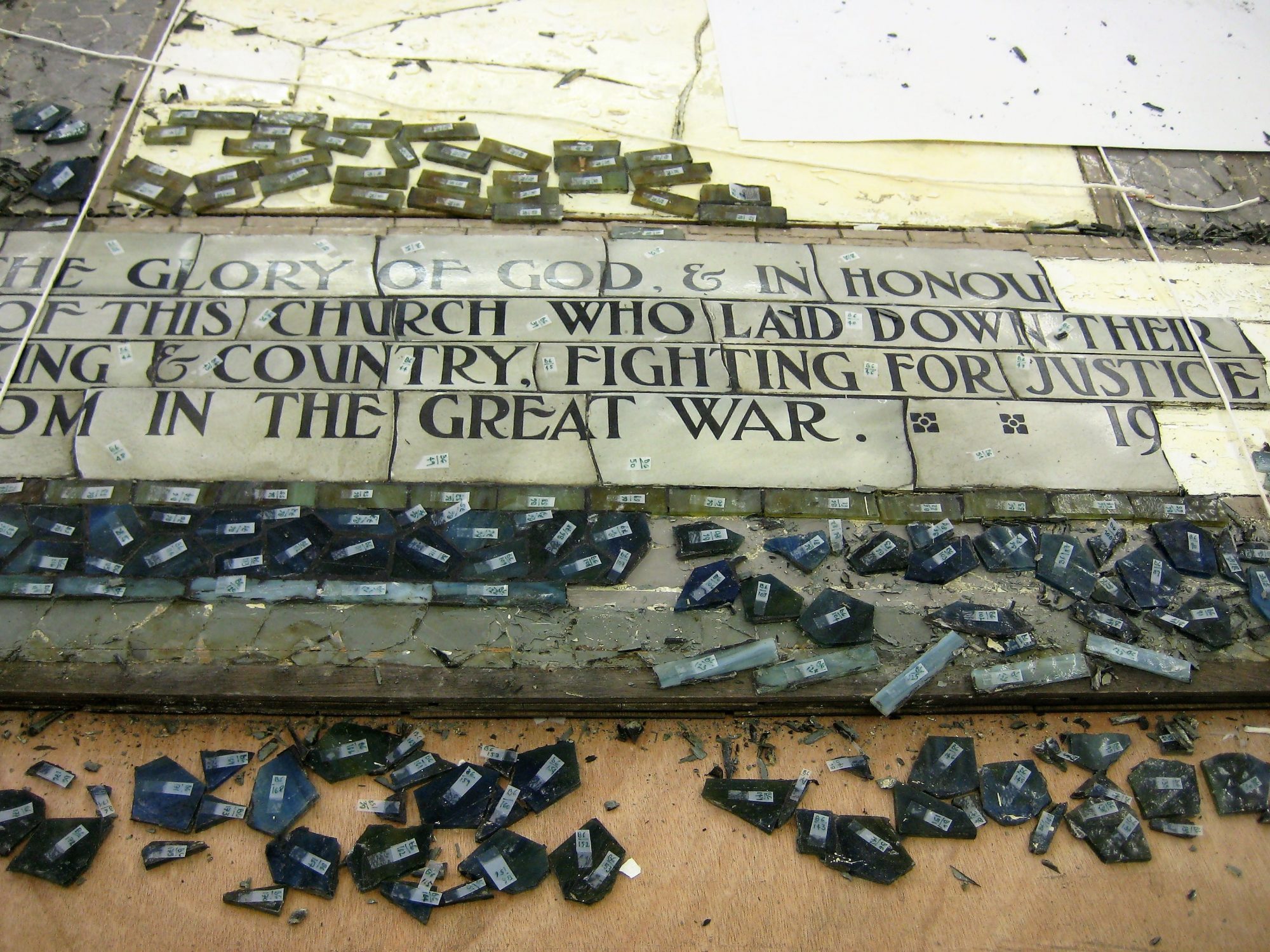 St. James’ Church, Mill Lane, West Derby, Liverpool, was designed by Edward Welch 1846. Glass Opus Sectile war memorials are particularly rare. Out of nearly 60,000 entries on the United Kingdom National Inventory of War Memorials, less than 20 are listed. Unfortunately, there is very scarce information about the St. James’ memorial and its commissioning. The only record that exists is a brief and tenuous entry in the parish records of mid-1920’s, where interest in dedicating a stained-glass window to the deceased is noted. Liverpool City Library, members of the local community, Whitefriars archives at the Museum of London and the Victoria and Albert Museum, and an expert in James Powell & Sons’ Ltd Opus Sectile were consulted with regards to provenance; unfortunately, the maker of this unique mosaic remains unknown.