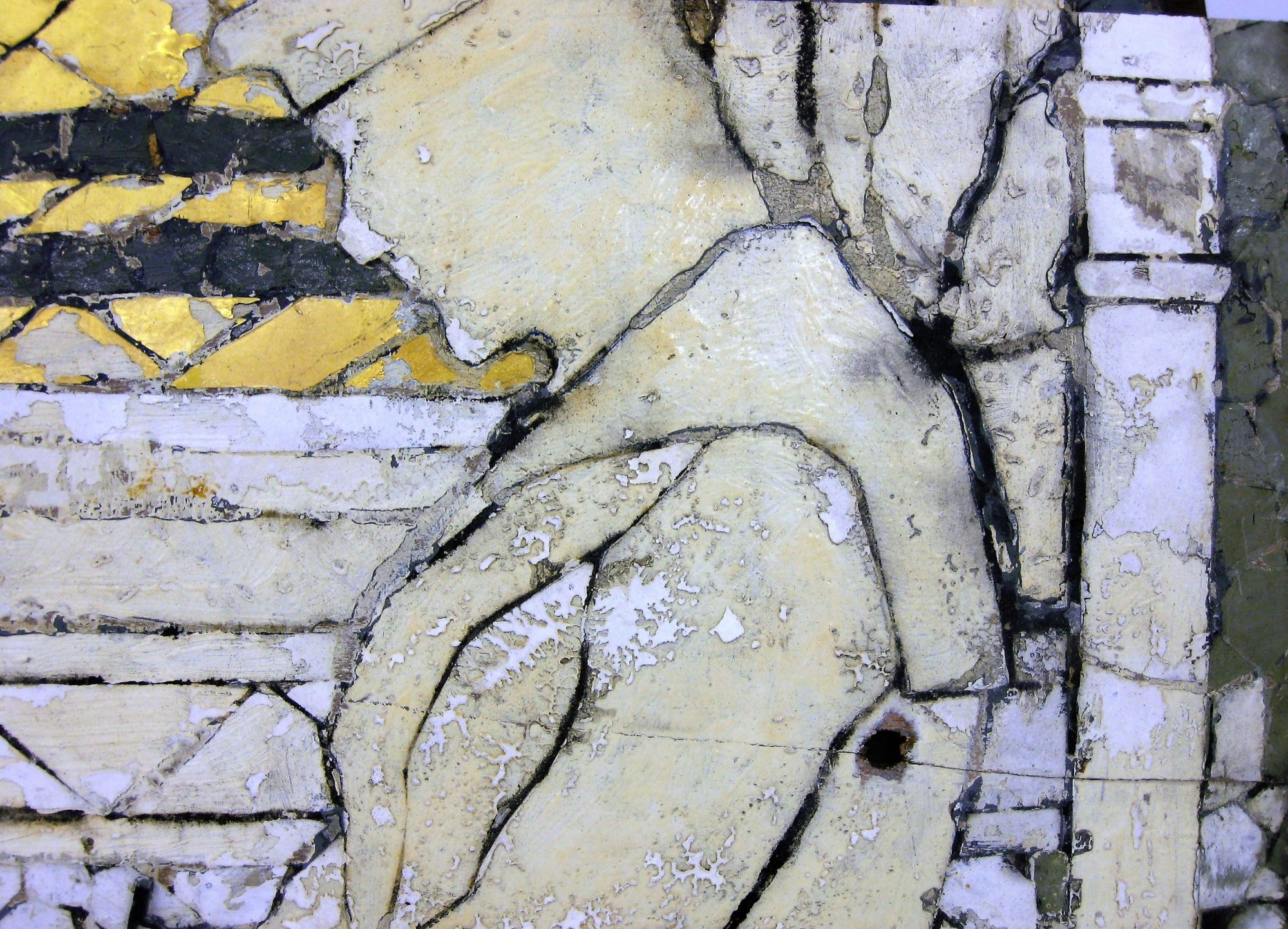 Once all glass had been removed, several exciting discoveries were made. Firstly, pencil outlines forming the figurative and architectural elements of the design were evident on top of the mortar, which had been applied over eight 4mm -depth wooden boards that ran horizontally. Secondly, translucent glass had been mounted on top of different coloured mortars, presumably to enhance and add further depth of colour. Thirdly, the eight wooden boards had been positioned on top of another four layers of wood; three of these were comprised of small sections that had been stitched together end-to-end, but not edge-to-edge. Each layer of wood ran at 90 degrees to the other.Several large screws remained, which connected the wooden layers and protruded beyond the bottom layer of wood. These findings provided evidence that the panel was fixed to the brick face and the glass mounted in-situ. There was no adhesive between each wooden layer; however there were excessive amounts of dust and dirt. Each layer of wood was vacuumed, recorded onto Melinex, removed, wrapped in acid free tissue and then stored.