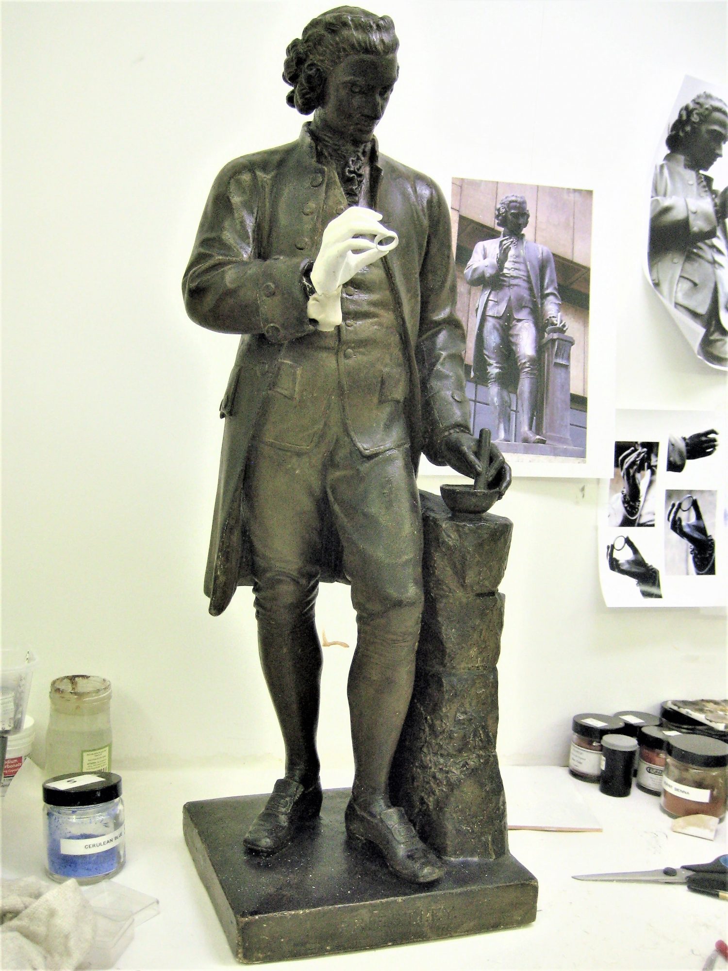 Cleaning. The surface was cleaned with a vulcanised rubber. Consolidation. All fugitive and lifting areas of surface decoration were consolidated with a 10% solution of an acrylic resin in acetone. In-filling/Reconstruction of Missing Areas. Having obtained detailed photographic evidence from the full scale sculpture of Priestly that is displayed in Chamberlain Square, Birmingham, it was possible to accurately reconstruct the missing hand, cuff and lens of the right arm (within the aesthetic constraints of the maquette). The hand was remodeled separately; a small stainless steel dowel connected the stump of the arm and the new hand and was secured/tacked into position with a fast setting epoxy resin. A 10% solution of an acrylic resin in acetone was painted onto the stump to form a barrier layer between it and the epoxy; the cuff was then reconstructed in-situ. These areas, along with areas to: the nose, several edges of the coat and waistcoat, and edges of the plinth were reconstructed with a plaster based filler. Filled and remodelled areas were consolidated with a 10% solution of an acrylic resin in acetone in preparation for retouching. Retouching. Remodeled areas and missing areas of decoration were retouched and toned with various combinations of a clear acrylic glaze, artist’s dry powder pigments and graphite powder. Protective Coating. A thin protective coating of Renaissance Wax was brushed onto the surface and buffed with a lint free cloth. |