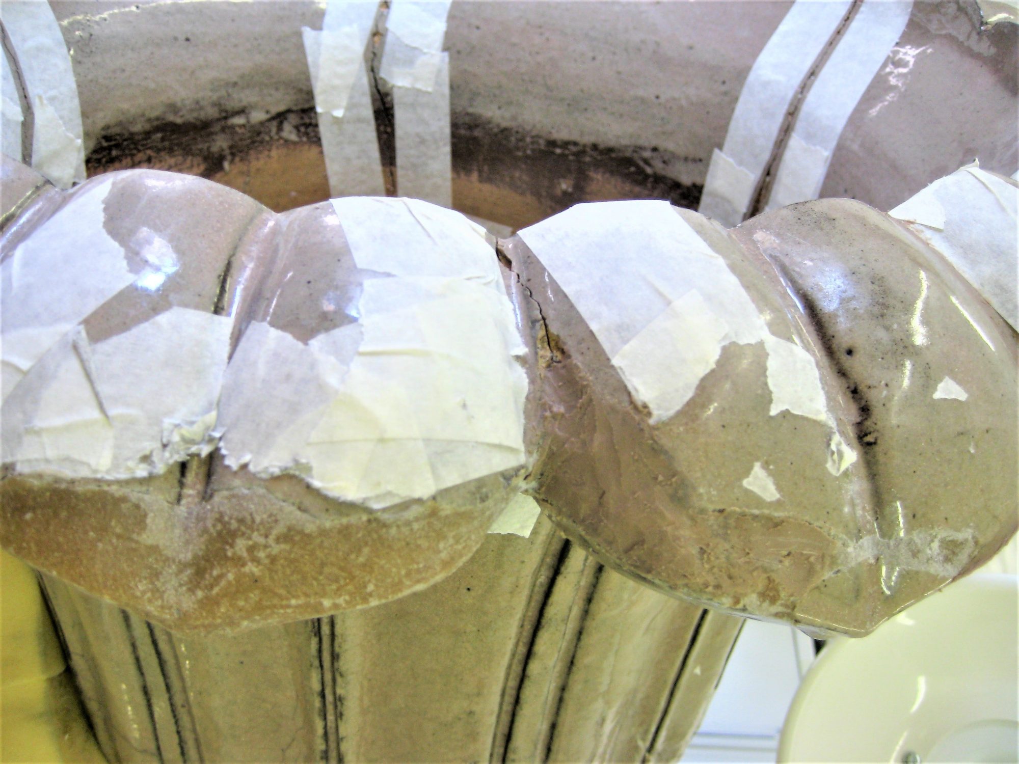 The urn and its base had been broken for some time. An attempt had been made at some point to reconstruct the broken sections with a silicone-type material.